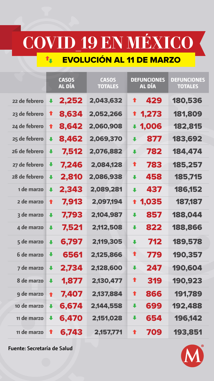 México registró 709 nuevas muertes por covid-19 en un solo día, de acuerdo con el reporte de la Secretaría de Salud que dio a conocer las cifras de la pandemia en el país al 12 de marzo de 2021.