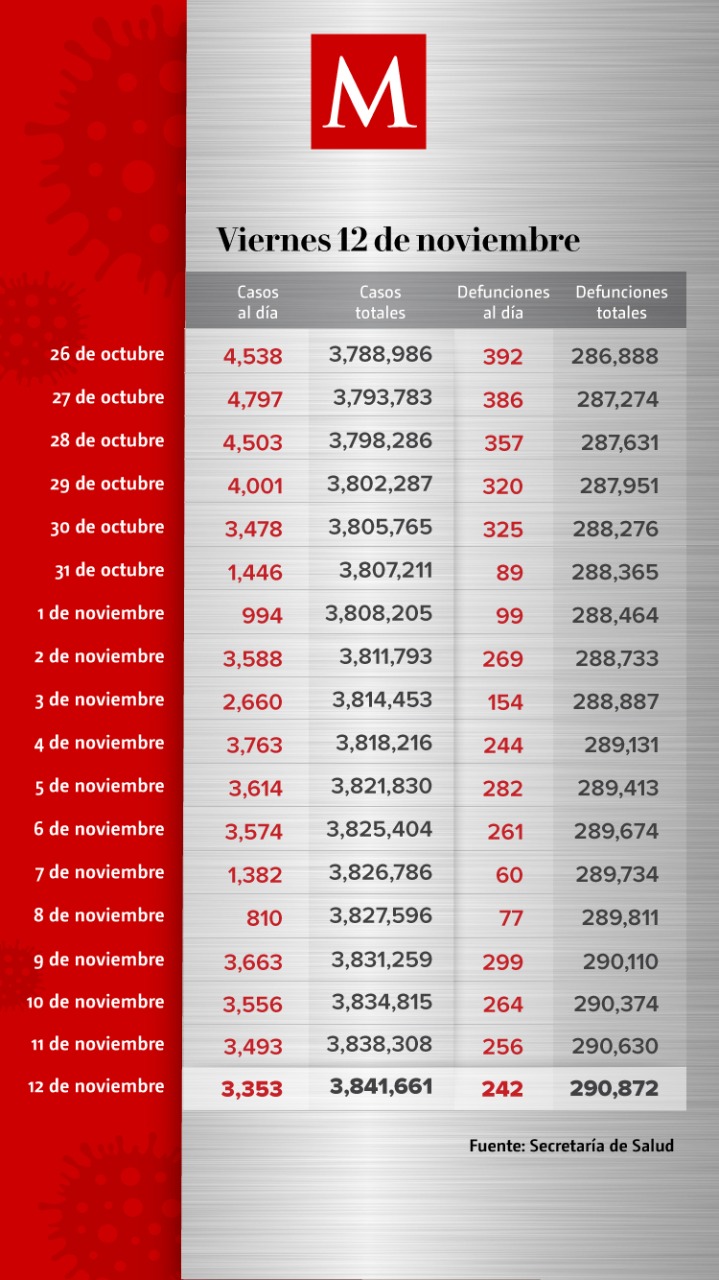 En las últimas 24 horas, México sumó 242 nuevas muertes por coronavirus y 3 mil 353 casos, con lo que se acumulan 290 mil 872 decesos y 3 millones 841 mil 661 contagios, de acuerdo con el informe de la Secretaría de Salud.