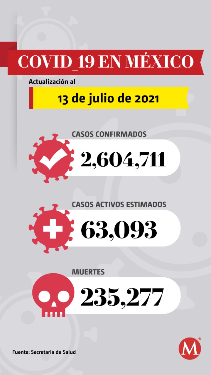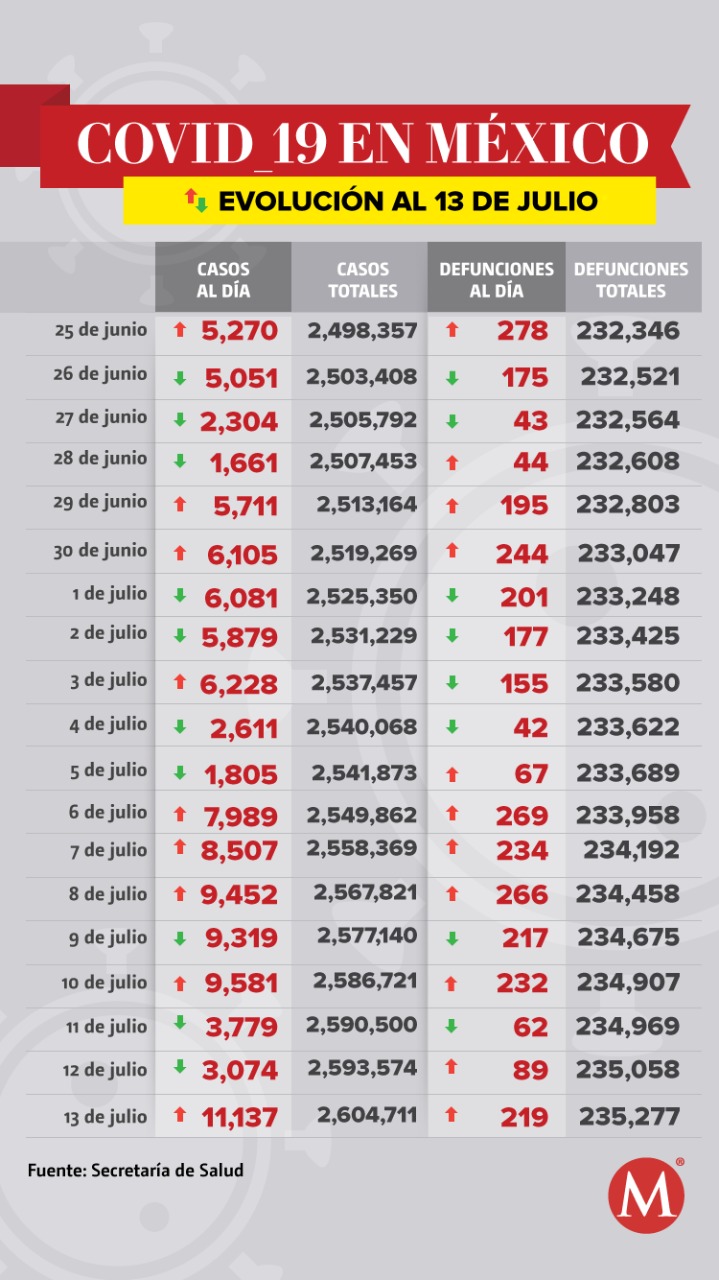La Secretaría de Salud informó, al corte del 13 de julio, que en 24 horas México registró 11 mil 137 mil contagios, 219 nuevas muertes por coronavirus y acumuló 2 millones 604 mil 711 casos, para un total de 235 mil 277 decesos.