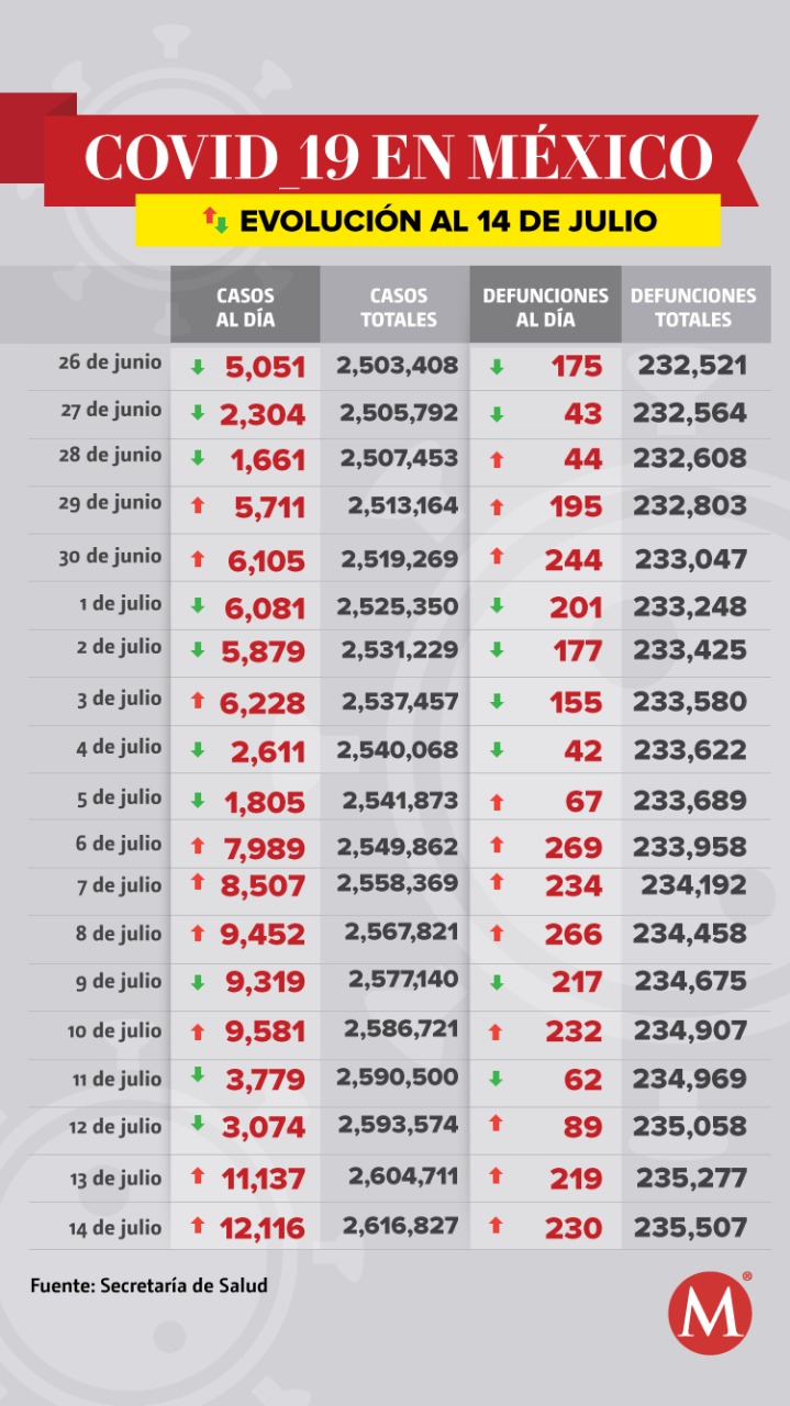México registró 12 mil 116 nuevos contagios de coronavirus en 24 horas, para un total de 2 millones 616 mil 827 casos acumulados, así como 235 mil 507 muertes, 230 más que ayer, de acuerdo con el informe técnico de la Secretaría de Salud publicado este 14 de julio.