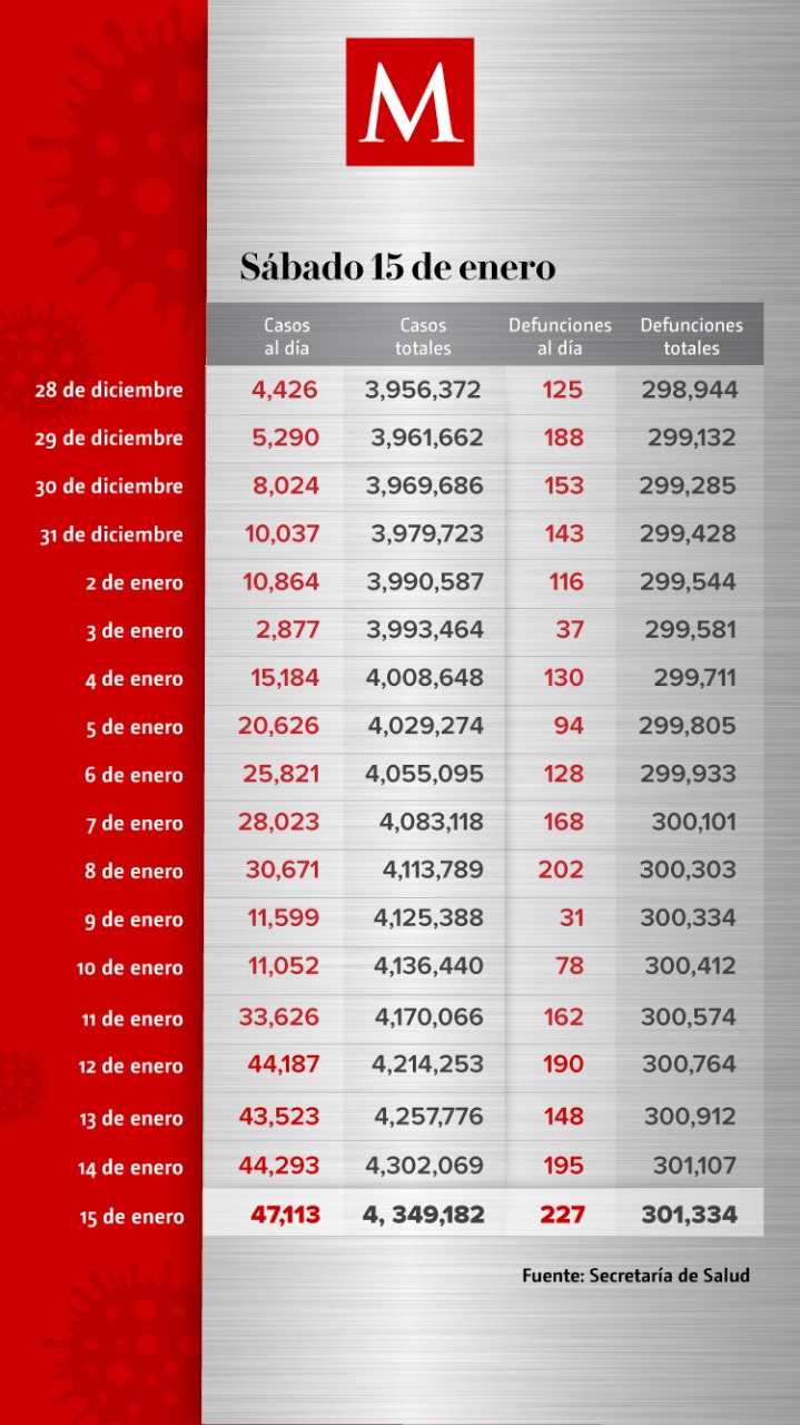 México sumó 47 mil 113 nuevos casos de coronavirus y 227 muertes en las últimas 24 horas, con lo que el país acumula 4 millones 349 mil 182 contagios de covid y 301 mil 334 defunciones, de acuerdo con el informe de la Secretaría de Salud.
