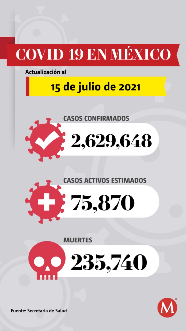 México registró 12 mil 821 nuevos contagios de coronavirus en 24 horas, para un total de 2 millones 629 mil 648 casos acumulados, así como 235 mil 740 muertes, 233 más que ayer, de acuerdo con el informe técnico de la Secretaría de Salud publicado este 15 de julio.