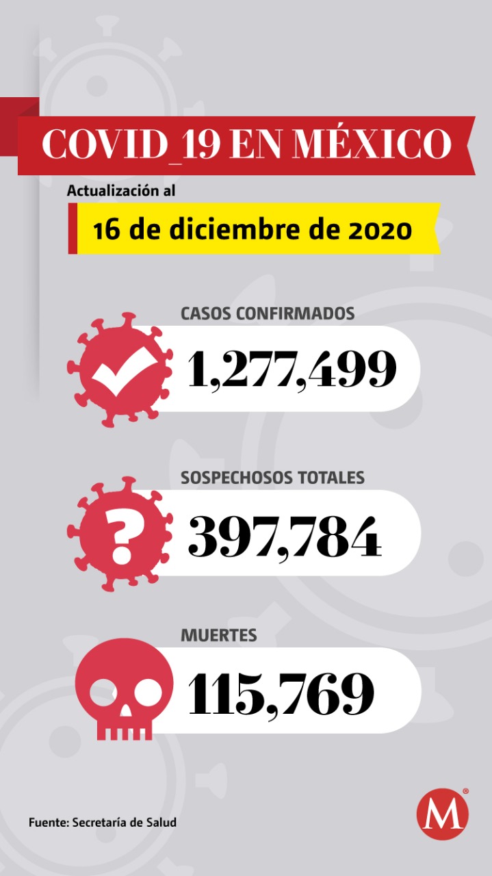 La Secretaría de Salud reportó que se han detectado un millón 277 mil 499 casos y 115 mil 769 muertes por coronavirus en México, de acuerdo con el reporte emitido este miércoles 16 de diciembre.