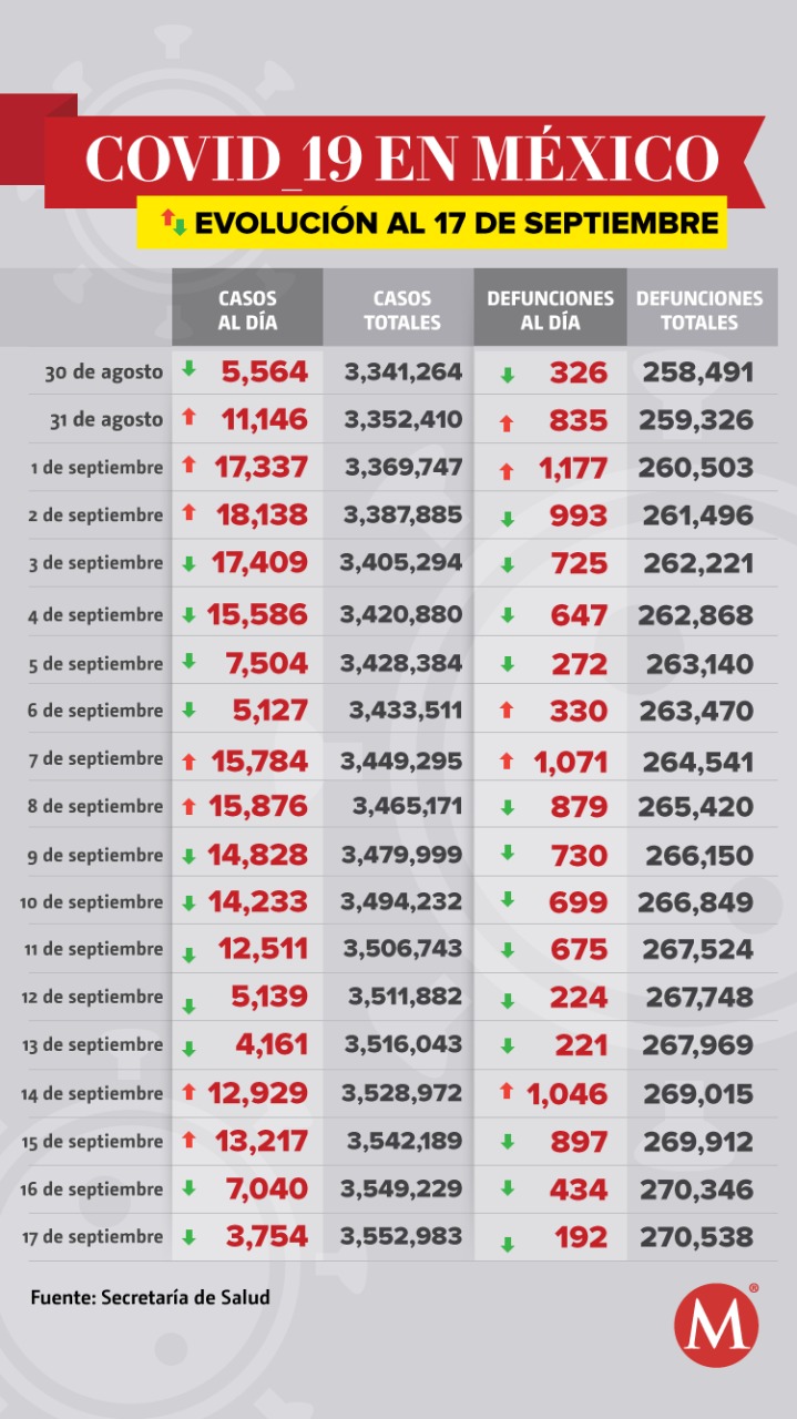 México suma 192 nuevas muertes por covid-19 y 3 mil 754 casos, con lo que se acumula un total de 3 millones 552 mil 983 contagios y 270 mil 538 decesos, de acuerdo con el informe de la Secretaría de Salud.