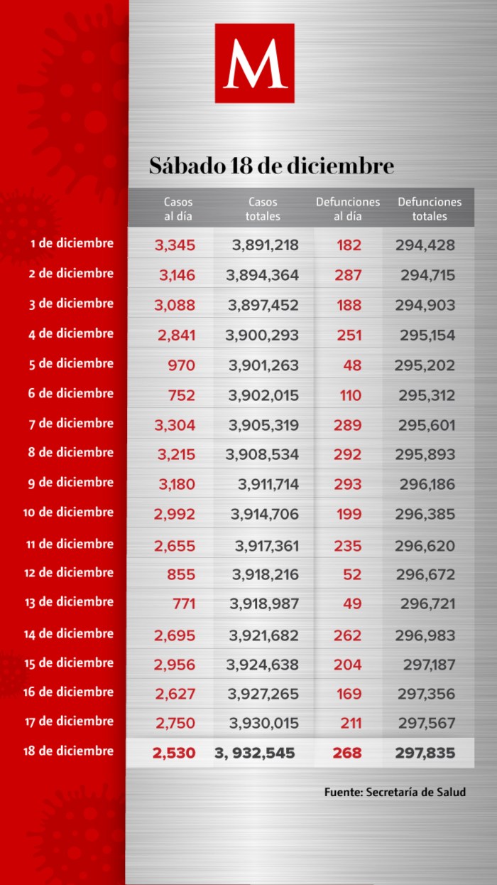 México suma 297 mil 835 muertes por covid-19 y registra 3 millones 932 mil 545 casos acumulados de coronavirus SARS-CoV-2, de acuerdo con el informe técnico de la Secretaría de Salud publicado este sábado en el que se añadieron 268 muertes y 2 mil 530 nuevos casos en 24 horas.