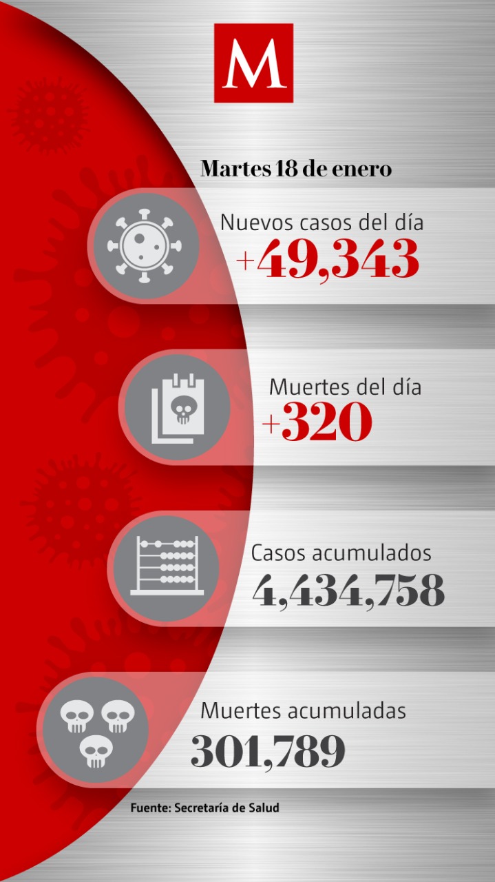 La dependencia dio a conocer que actualmente hay 4 millones 434 mil 758 contagios acumulados y 301 mil 789 defunciones. En el comunicado técnico también contabiliza: