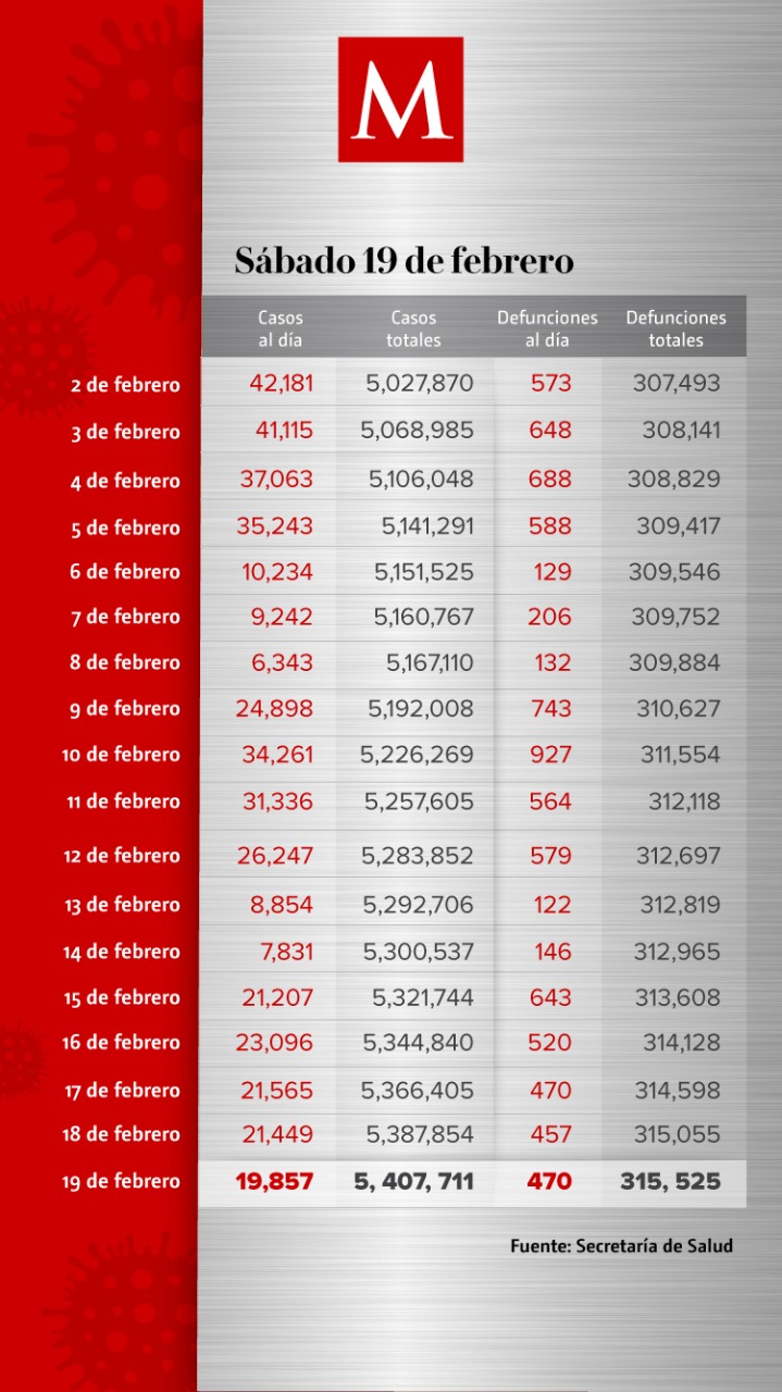En las últimas 24 horas, México sumó 19 mil 857 nuevos casos de coronavirus y 470 muertes, con lo que se acumulan 5 millones 407 mil 711 contagios y 315 mil 525 defunciones, de acuerdo con el comunicado técnico de la Secretaría de Salud.