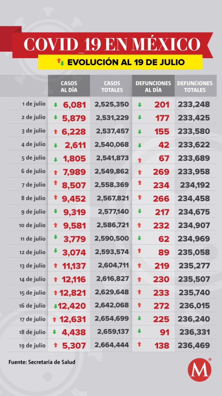 México suma 236 mil 469 muertes por coronavirus SARS-CoV-2, 138 más que ayer, y acumula 2 millones 644 mil 444 casos, de acuerdo al informe dado a conocer esta tarde por la Secretaría de Salud.