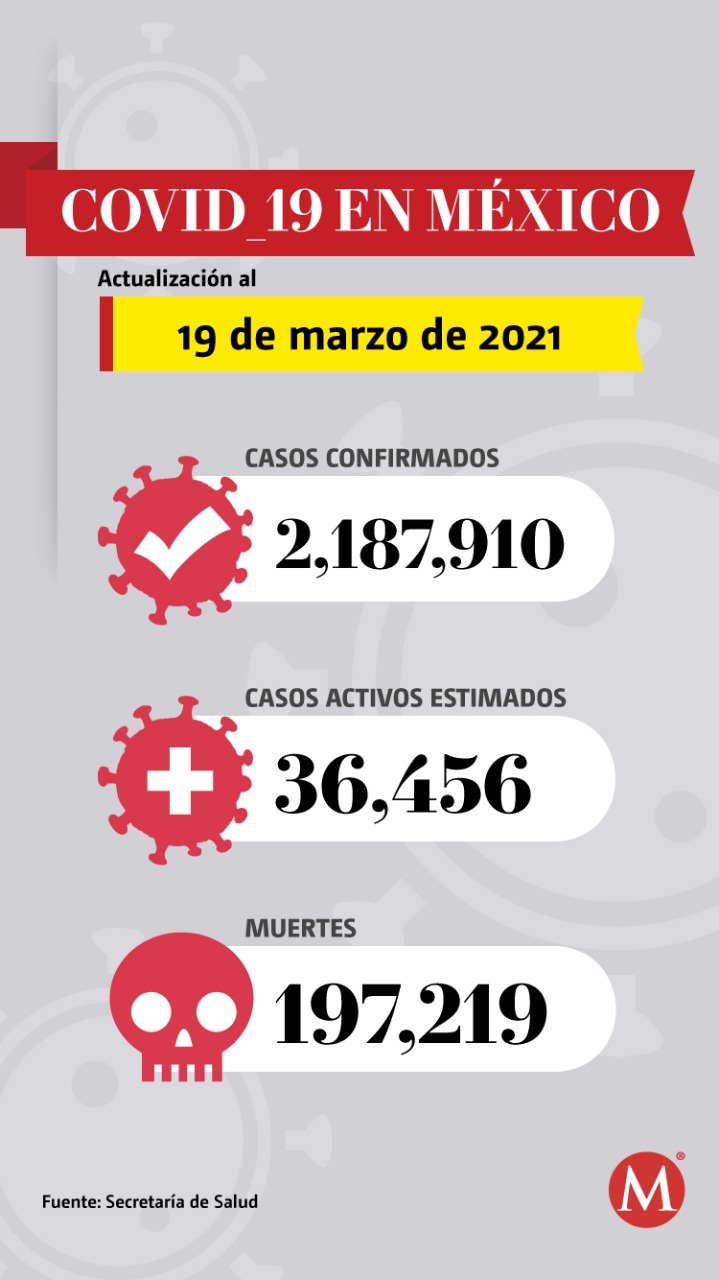 México registró 613 nuevas muertes y 5 mil 722 nuevos casos de covid-19 en un solo día, de acuerdo con el reporte de la Secretaría de Salud que dio a conocer las cifras de la pandemia en el país al 19 de marzo de 2021.