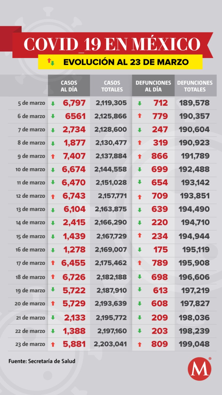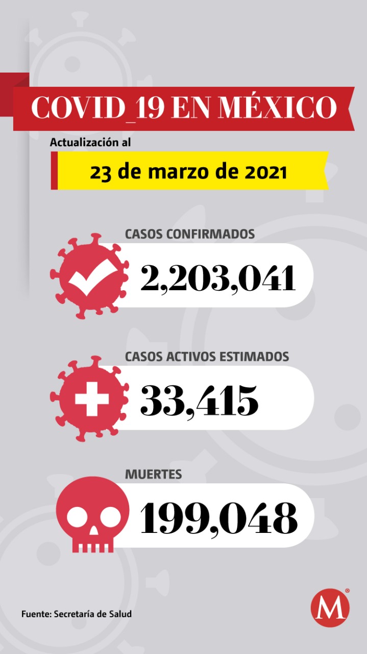 México registró 809 nuevas muertes por covid-19 en un solo día, de acuerdo con el reporte de la Secretaría de Salud que dio a conocer las cifras de la pandemia en el país al 23 de marzo de 2021.