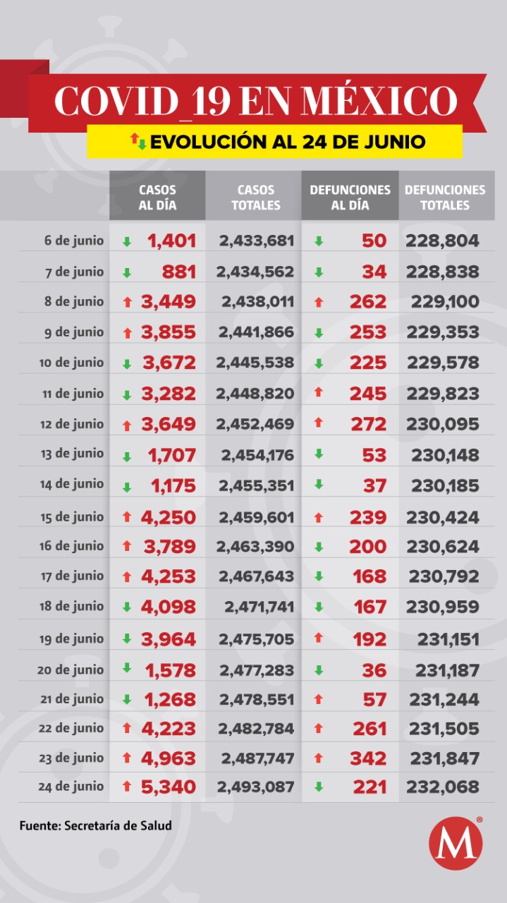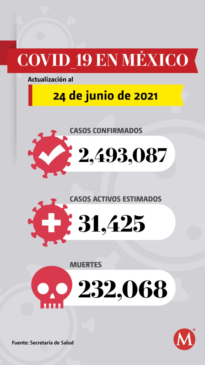 México suma 232 mil 68 muertes por coronavirus SARS-CoV-2 y acumula dos millones 2 millones 493 mil 87 casos, de acuerdo al informe técnico dado a conocer por la Secretaría de Salud.