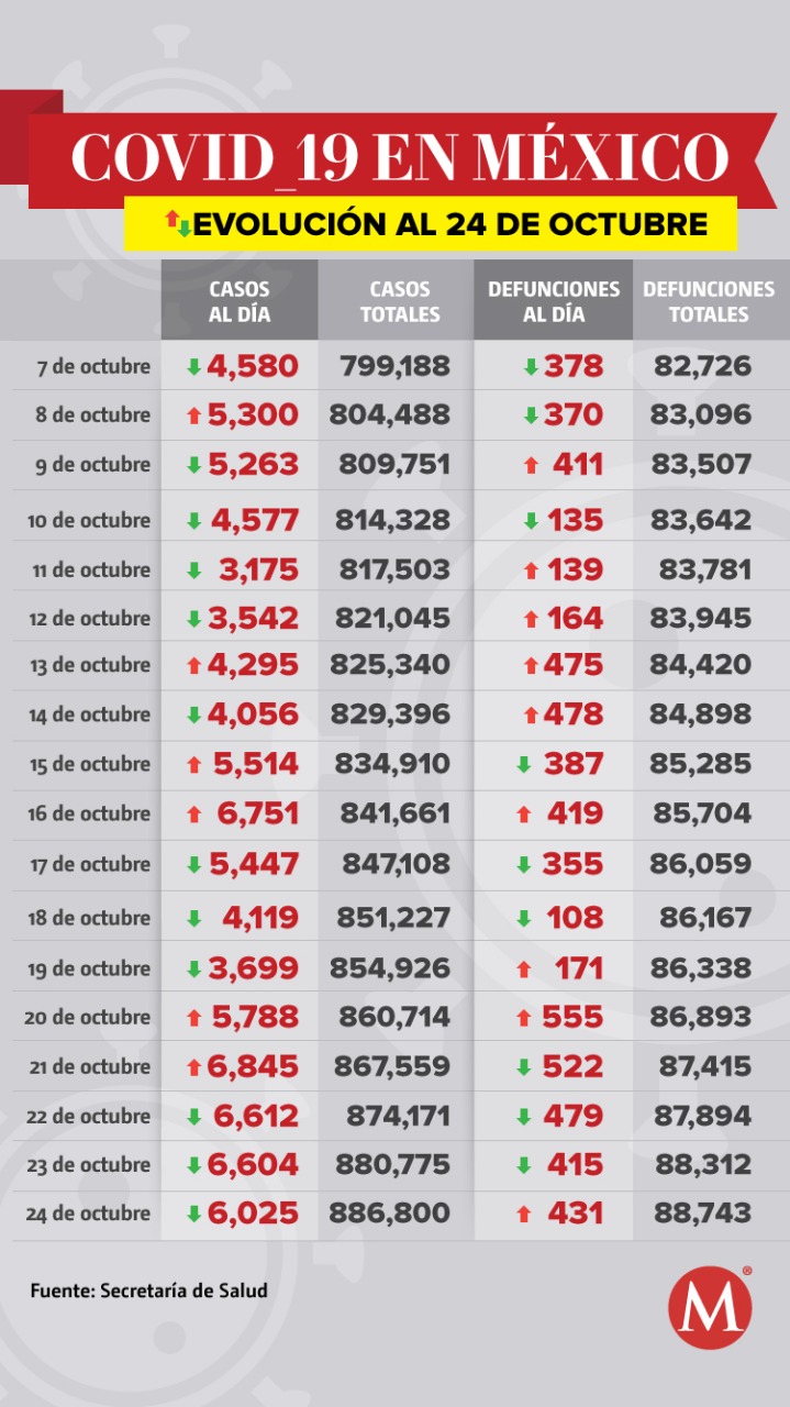 Autoridades de la Secretaría de Salud informaron que México alcanzó 88 mil 743 muertes por coronavirus SARS-CoV-2 y acumula 886 mil 800 casos confirmados, de los cuales un millón 66 mil 646 son negativos; además se tienen 335 mil 143 casos sospechosos.