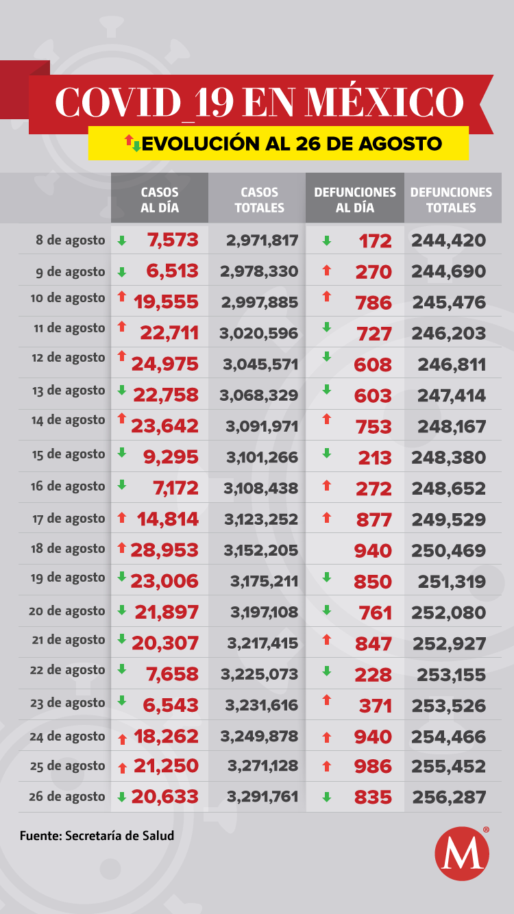 México sumó 20 mil 633 nuevos casos de coronavirus SARS-CoV-2 en las últimas 24 horas, con lo que se acumulan un total de 3 millones 291 mil 761 contagios y 256 mil 287 muertes, de acuerdo con el informe técnico dado a conocer por la Secretaría de Salud.