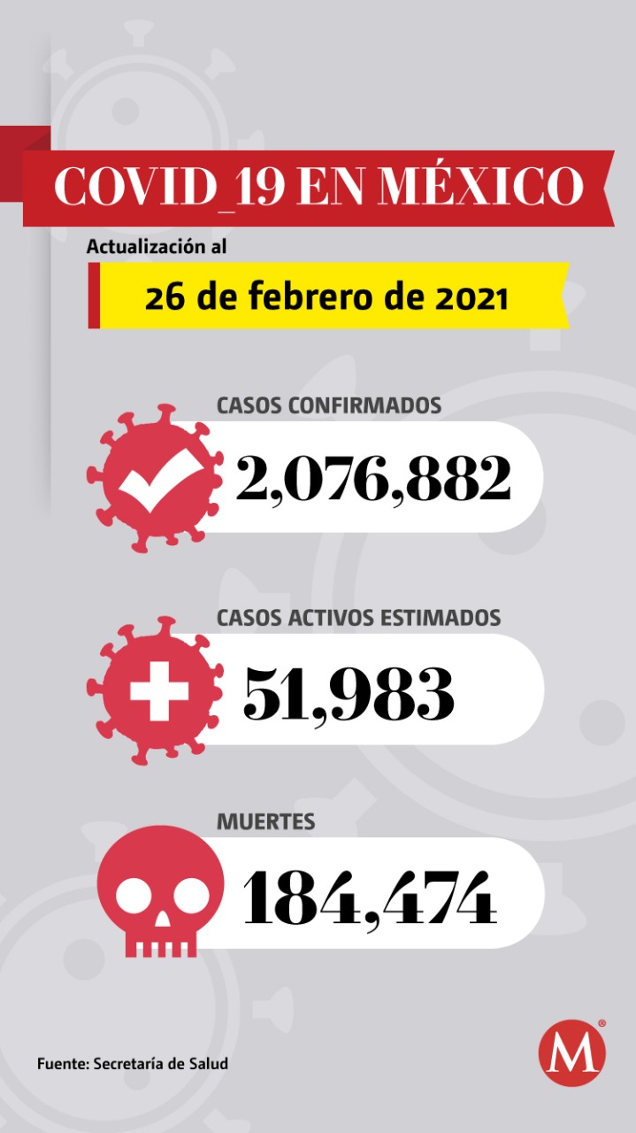 México registró 782 nuevas muertes y 7 mil 512 casos por covid-19 en un solo día, de acuerdo con el reporte de la Secretaría de Salud que dio a conocer las cifras de la pandemia en el país al 26 de febrero de 2021.