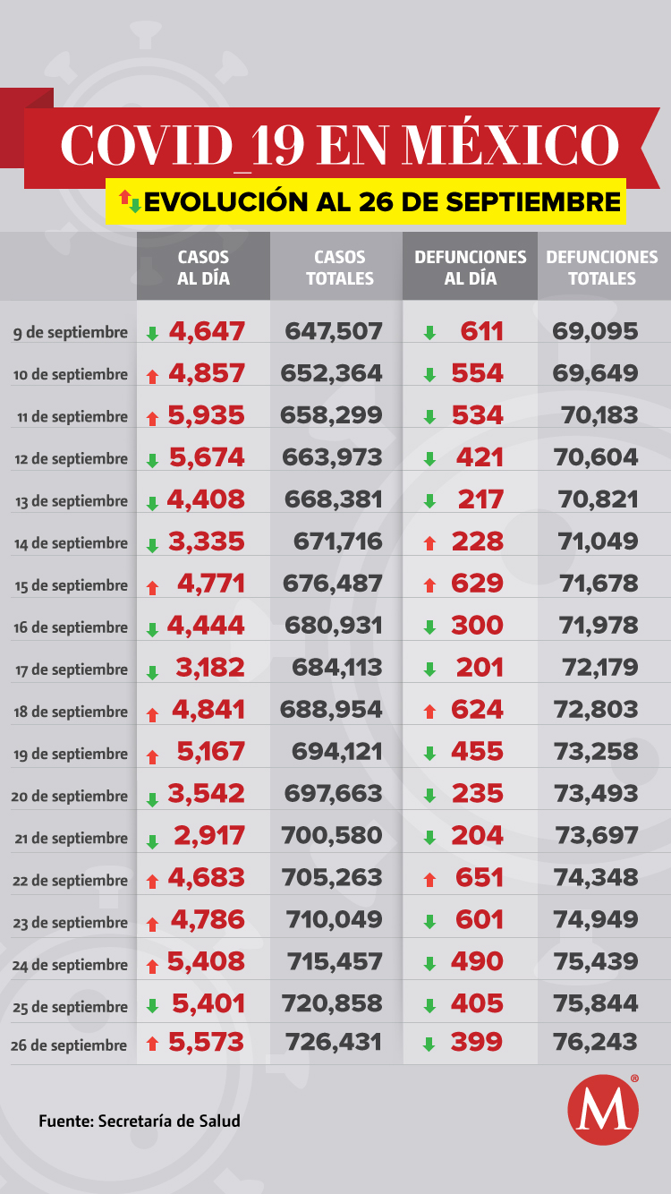 Hoy México alcanzó 76 mil 243 muertes por coronavirus SARS-CoV-2 y acumula 726 mil 431 casos confirmados, de los cuales 851 mil 864 son negativos; además registra 86 mil 762 casos sospechosos, informaron autoridades de la Secretaría de Salud.