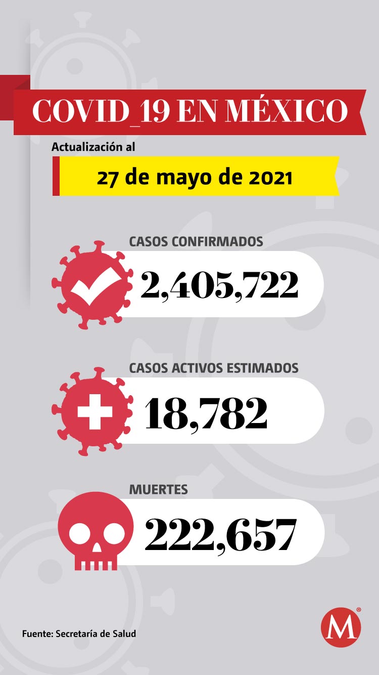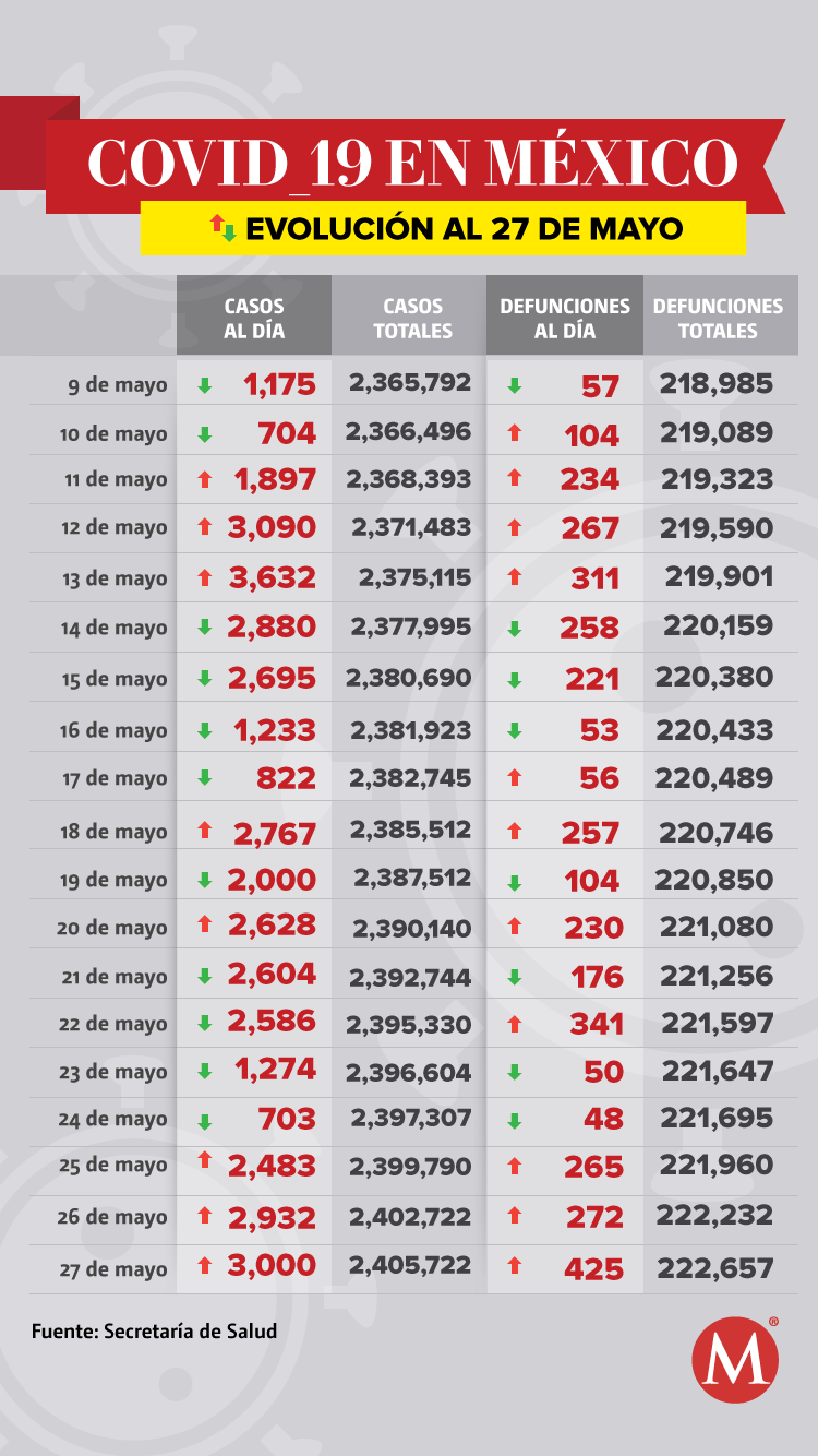 México acumula 222 mil 657 muertes por coronavirus, 425 decesos más que ayer, de acuerdo con el informe diario de la Secretaría de Salud presentado el jueves 27 de mayo por José Luis Alomía, director general de Epidemiología.