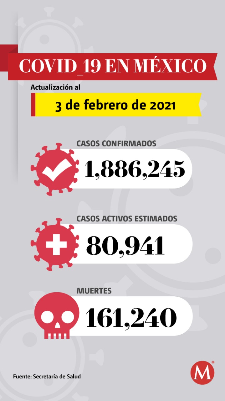 México suma mil 707 nuevas muertes y 12 mil 153 casos de covid-19 en un solo día, de acuerdo con el reporte de la Secretaría de Salud que dio a conocer las cifras de la pandemia en el país al 3 de febrero.