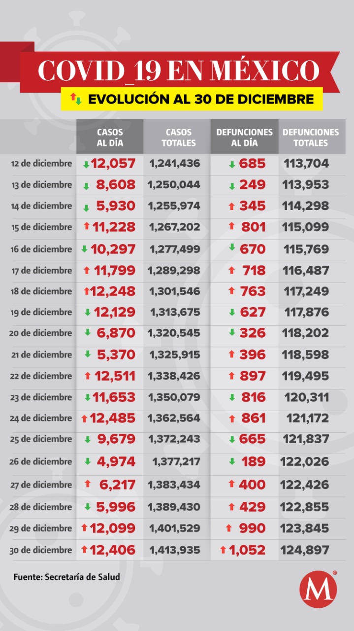 México suma 124 mil 897 muertes por covid-19 este miércoles, de acuerdo con el reporte de la Secretaría de Salud que dio a conocer las cifras de la pandemia en el país al 30 de diciembre.