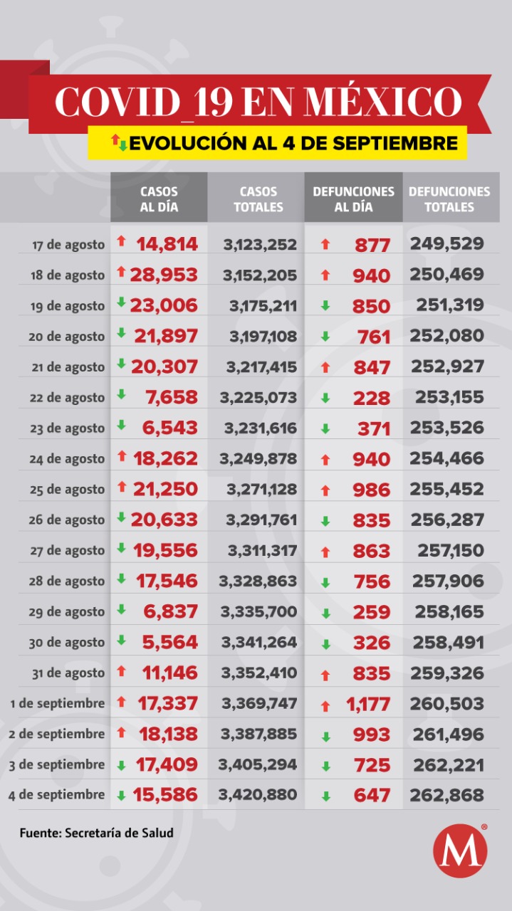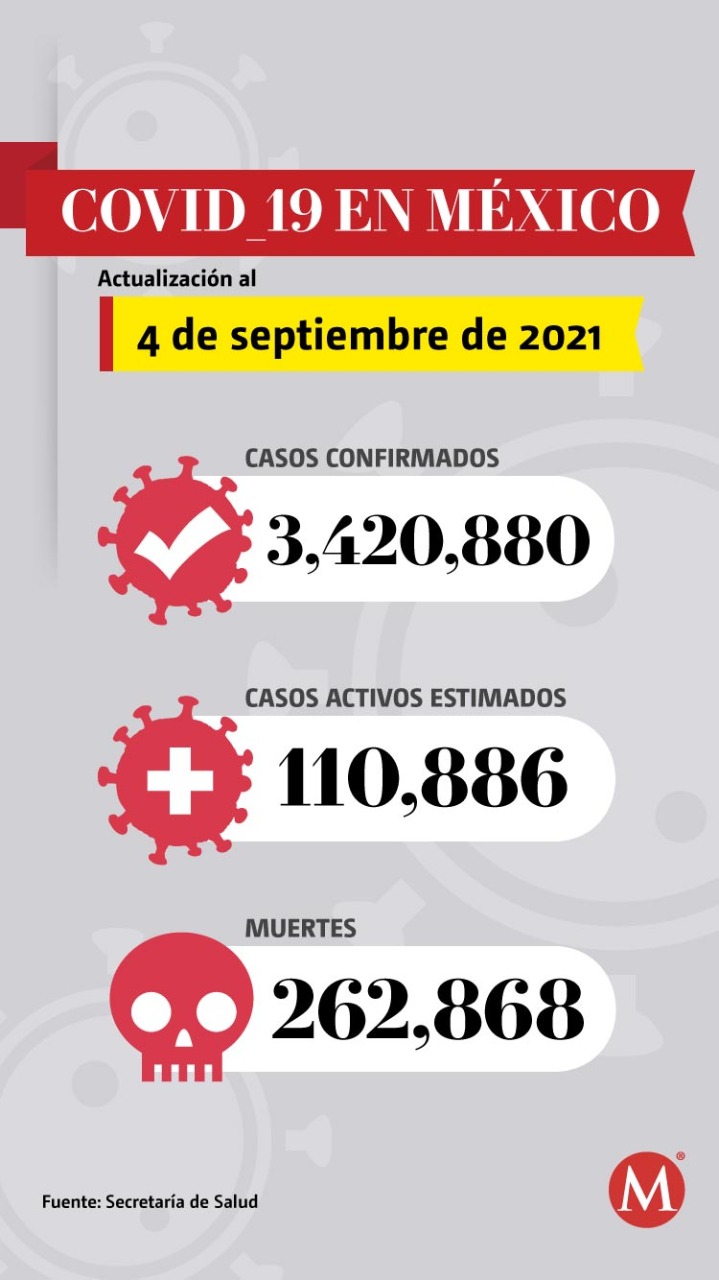 México suma 262 mil 868 muertes por covid-19 y registra 3 millones 420 mil 880 casos acumulados de coronavirus SARS-CoV-2, de acuerdo con el informe técnico de la Secretaría de Salud publicado este sábado, en el que se sumaron 15 mil 586 nuevos casos en 24 horas y hay 647 muertes adicionales.
