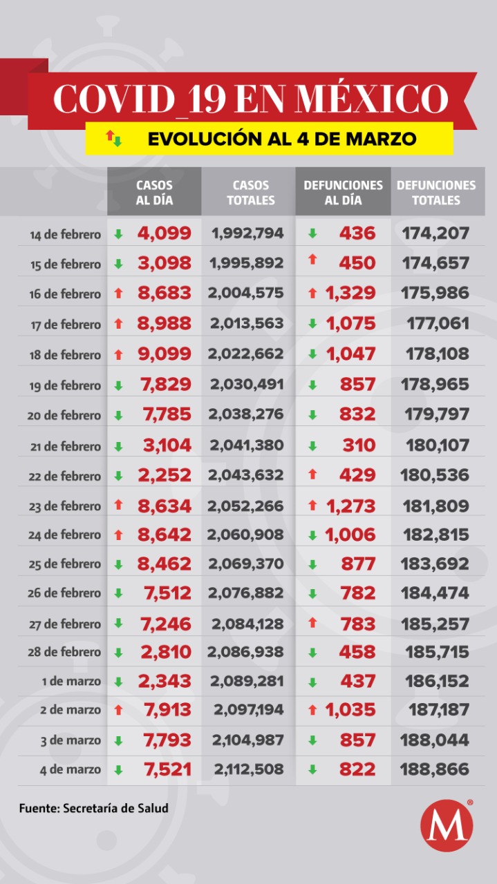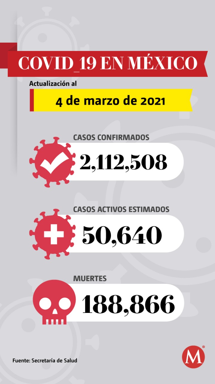 México registró 822 nuevas muertes por covid-19 en un solo día, de acuerdo con el reporte de la Secretaría de Salud que dio a conocer las cifras de la pandemia en el país al 4 de marzo de 2021.