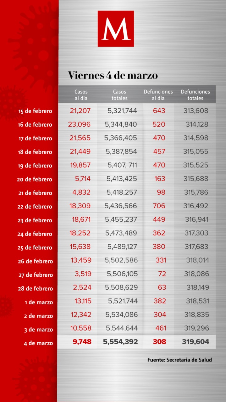 México suma 5 millones 554 mil 392 contagios y 319 mil 604muertes por coronavirus, de los cuales en las últimas 24 horas se agregaron al reporte de la Secretaría de Salud 9 mil 748 casos y 308 defunciones.