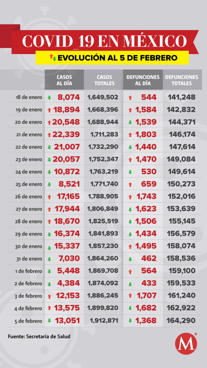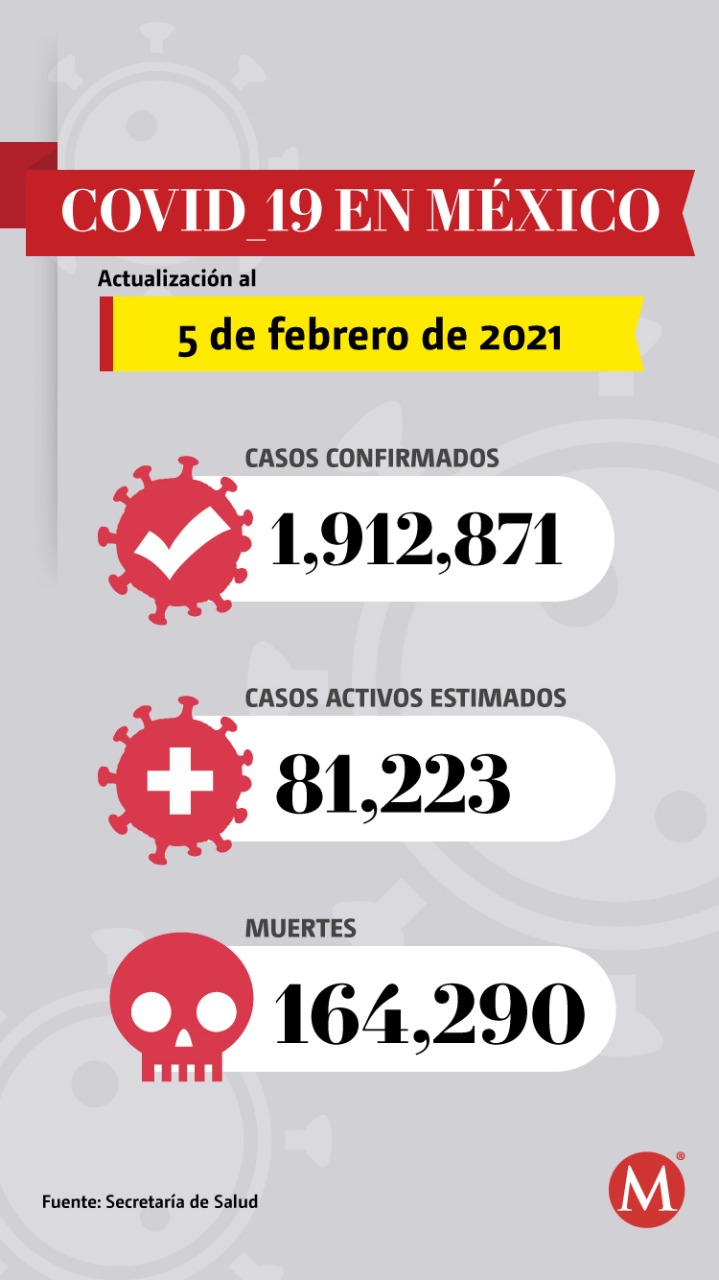 México suma mil 368 nuevas muertes por covid-19, de acuerdo con el reporte de la Secretaría de Salud que dio a conocer las cifras de la pandemia en el país al 5 de febrero.