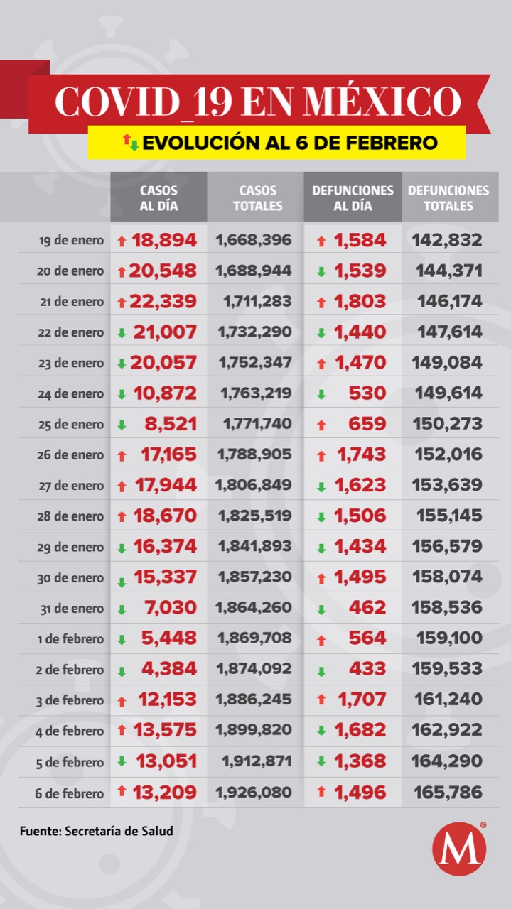 México resgistró mil 496 nuevas muertes por covid-19 en un día, de acuerdo con el reporte de la Secretaría de Salud que dio a conocer las cifras de la pandemia en el país al 6 de febrero.