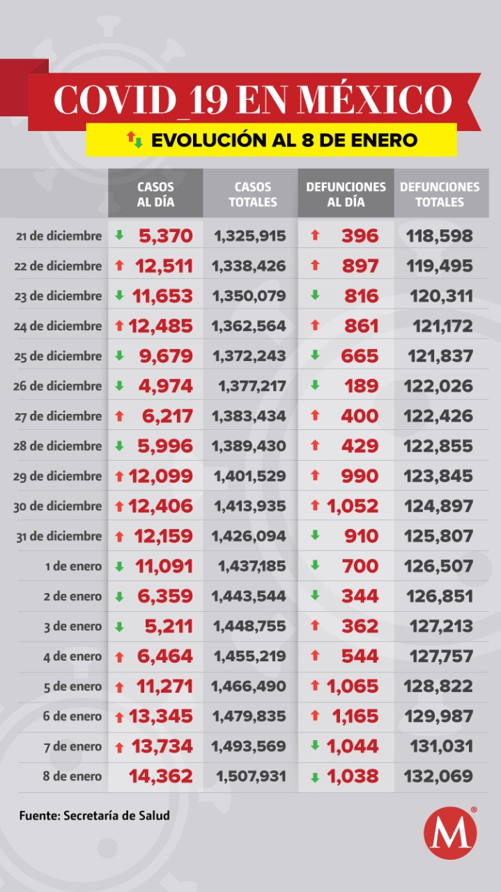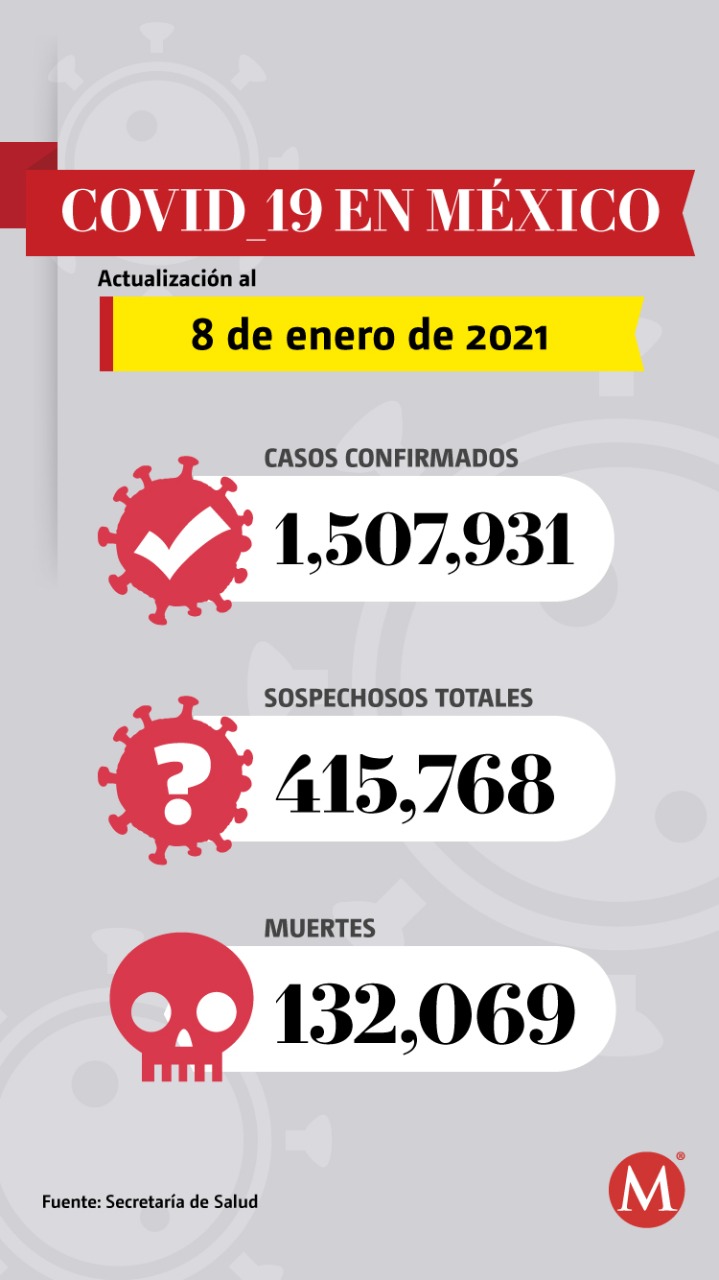 México sumó 132 mil 69 muertes por covid-19 este viernes, de acuerdo con el reporte de la Secretaría de Salud que dio a conocer las cifras de la pandemia en el país al 8 de enero de 2021.