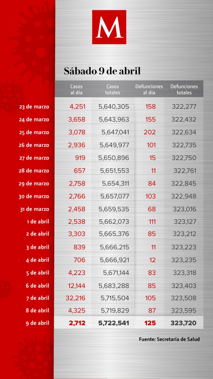 México sumó 2 mil 712 nuevos casos de coronavirus y 125 muertes en las últimas 24 horas, con lo que se acumulan 5 millones 722 mil 521 contagios y 323 mil 720 defunciones, de acuerdo con el informe de la Secretaría de Salud.