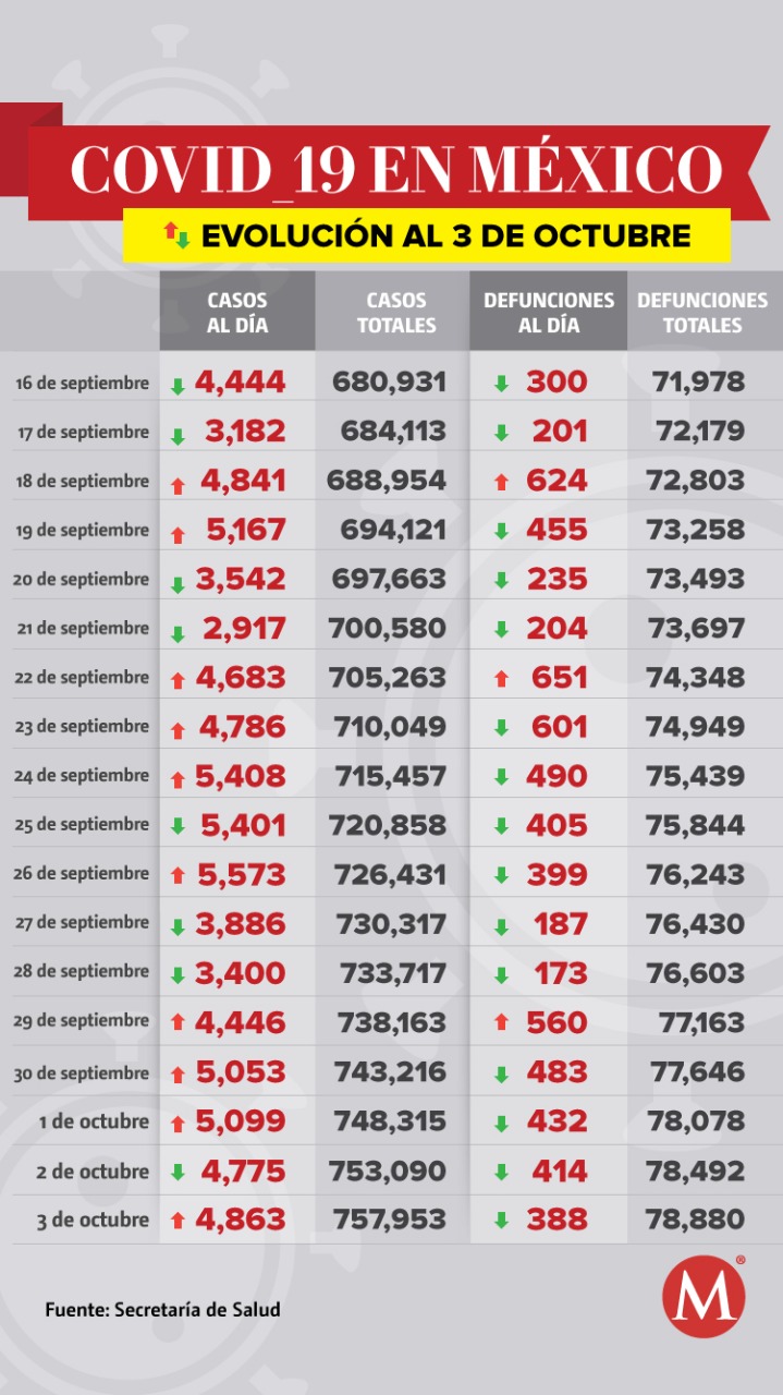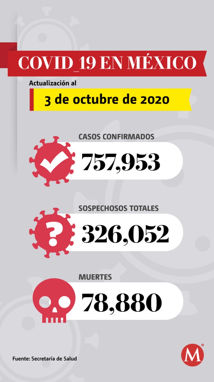 La Secretaría de Salud informó que hoy México alcanzó 78 mil 880 muertes por coronavirus SARS-CoV-2 y acumula 757 mil 953 casos confirmados, de los cuales 913 mil 370 son negativos; además se tienen 326 mil 052 casos sospechosos.
