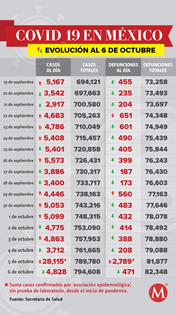 La Secretaría de Salud informó que hoy México alcanzó 82 mil 348 muertes por coronavirus SARS-CoV-2 y acumula 794 mil 608 casos confirmados, de los cuales 933 mil 316 son negativos; además se tienen 293 mil 331 casos sospechosos.