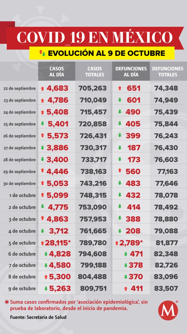 México alcanzó 83 mil 507 muertes por coronavirus SARS-CoV-2 y acumula 809 mil 751 casos confirmados, de los cuales 956 mil 251 son negativos; además se tienen 302 mil 645 casos sospechosos, informaron autoridades de la Secretaría de Salud.