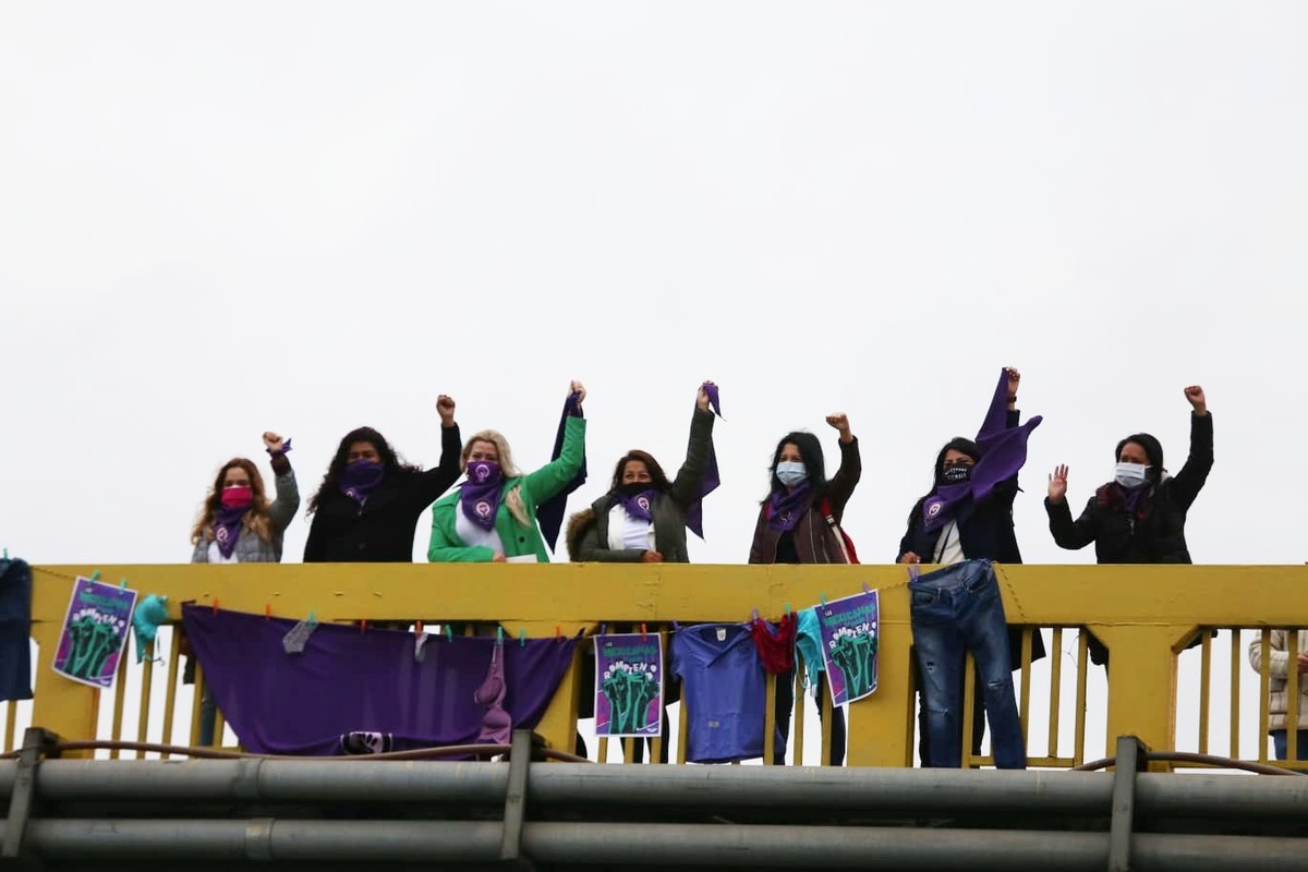A primera hora de este lunes un grupo de apenas diez mujeres se hicieron presentes en el Puente del Papa en donde colocaron en sus barandales una pañoleta morada, blusas, pantalones y accesorios de mujer.