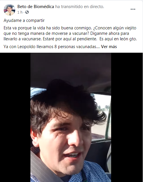 Con el lema "esta va porque la vida ha sido buena conmigo" Beto, un joven leonés decidió invertir un poco de tiempo en los adultos mayores de la ciudad y decidió ofrecerse como conductor para acercarlos a recibir la vacuna contra el coronavirus.