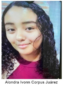 Alondra Ivonn Corpus Juárez, de 17 años, salió de su casa el 21 de marzo de este año en San Felipe sin que hasta ahora se sepa nada de ella; tiene cabello rubio, largo y chino; sus ojos son de color café oscuro y rasgados; tiene una estatura de 1.63 m y un peso de 65 kg. Vestía una falda de mezclilla, blusa blanca y tenis negros.