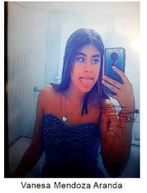 Vanessa Mendoza Aranda de quince años fue vista por última vez cuando salía de su hogar el 26 de marzo de este año; entre sus características destacan: una bola pequeña en el labio inferior izquierdo; cabello ondulado; ojos grandes y de color negro; cabello ondulado corto y café; estatura 1. 60 m y peso 46 kg.
