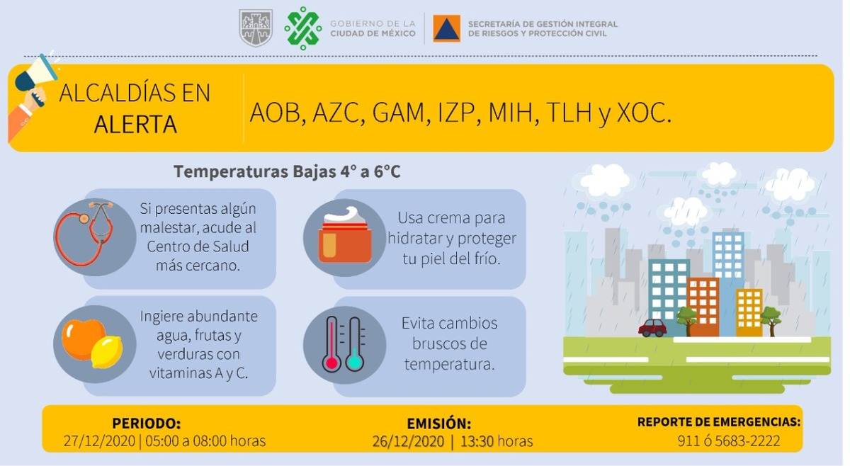 Ante cualquier emergencia por las bajas temperaturas u otro percance, la SGIRPC señaló que la ciudadanía tendrá que comunicarse a los teléfonos 911, al 5658 1111 de Locatel, y al 5683 2222 de la dependencia de Gobierno.