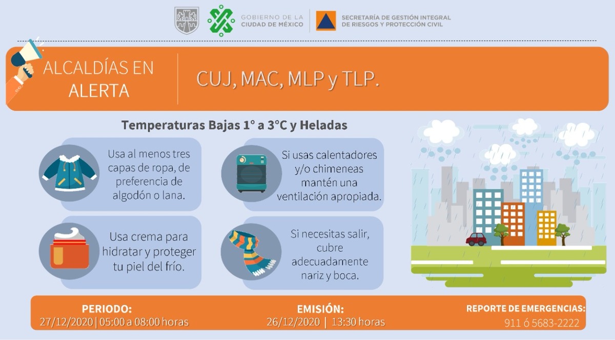 La Secretaría de Gestión Integral de Riesgos y Protección Civil (SGIRPC), activó la alerta naranja por pronóstico de temperaturas bajas y heladas, para el día de mañana, en cuatro alcaldías de la Ciudad de México; de igual manera se activó la alerta amarilla para siete alcaldías más.