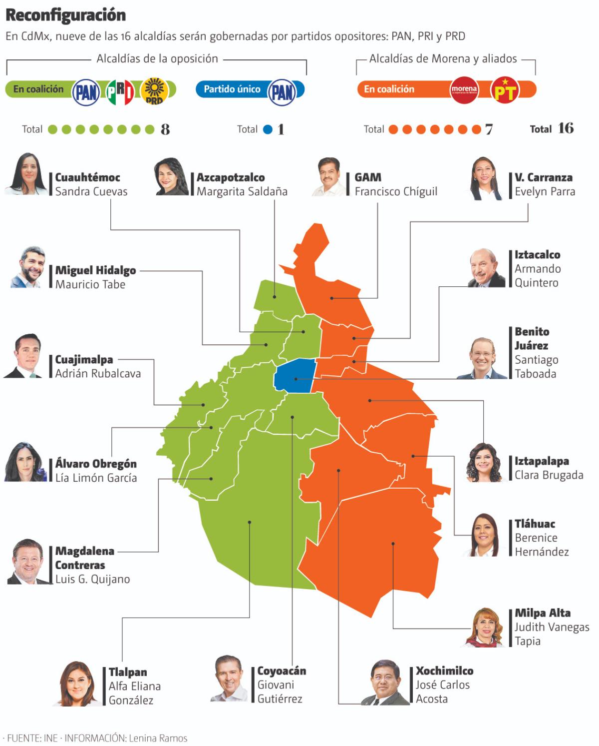 La alianza de alcaldes del PRI-PAN-PRD tendrá bajo su mandato a la mitad del territorio capitalino, incluida Cuauhtémoc, corazón de la ciudad. No obstante, las demarcaciones de más población quedaron en manos de Morena: Iztapalapa y Gustavo A. Madero.