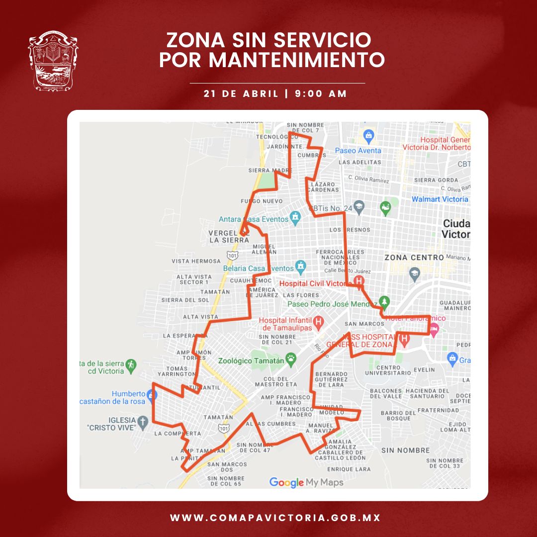 El gobierno municipal de Ciudad Victoria, que encabeza Eduardo Gattas, informa que este jueves 21 de abril, a partir de las 9 de la mañana se dará mantenimiento a los equipos de bombeo ubicado en la estación la penita.