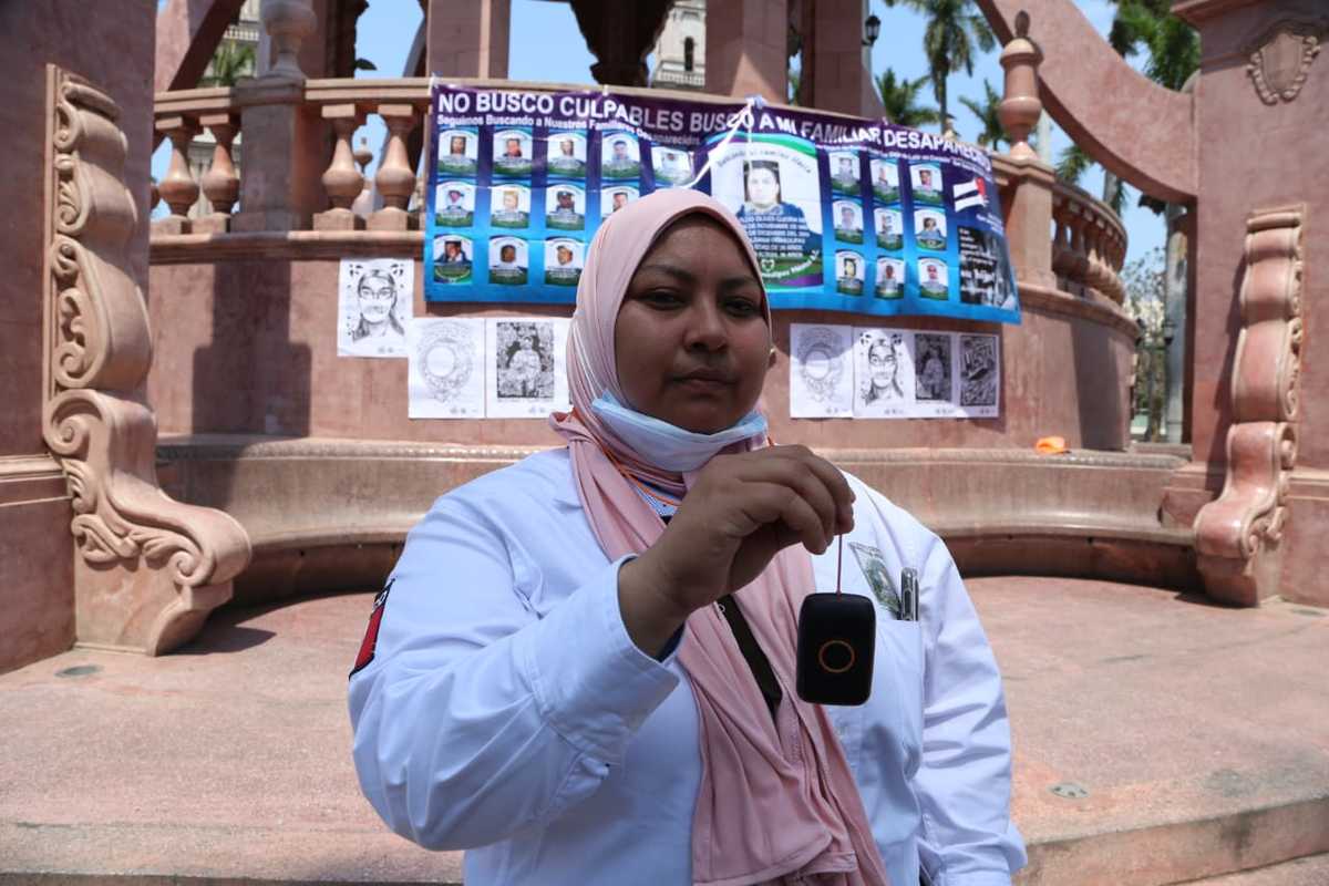 “En caso de que me sienta en peligro aplanados el botón y las autoridades comienzan a rastrear en caso de que me sienta en peligro", indicó la mujer, madre de un bebé que porta una playera con la foto de su hermano.