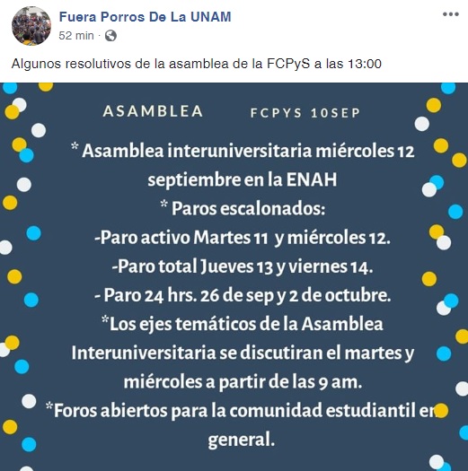 La Facultad de Ciencias Políticas y Sociales (FCPyS) de la UNAM acordó regresar al paro de actividades durante toda la semana al igual que la Facultad de Filosofía y Letras.