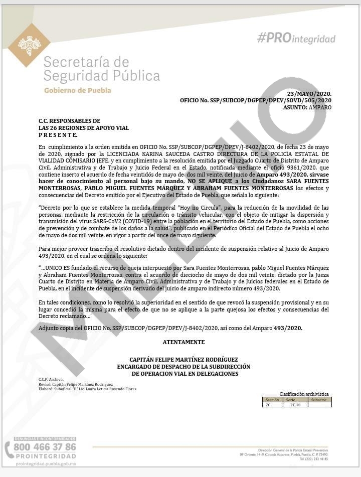 "En cumplimiento a la resolución emitida por el Juzgado Cuarto de Distrito de Amparo Civil Administrativo y de Trabajo y Juicio Federal en el Estado, notificada mediante el oficio 9361/2020, que contiene inserto el acuerdo de fecha veintidós de mayo de dos mil veinte, del Juicio de Amparo 493/2020, sírvase hacer de conocimiento al personal bajo su mando, NO SE APLIQUE a los Ciudadanos SARA FUENTES MONTERROSAS, PABLO MIGUEL FUENTES MÁRQUEZ y ABRAHAM FUENTES MONTERROSAS los efectos y consecuencias del Decreto emitido por el Ejecutivo del Estado de Puebla", detalló el informe, del cual Notivox DIGITAL tiene una copia.