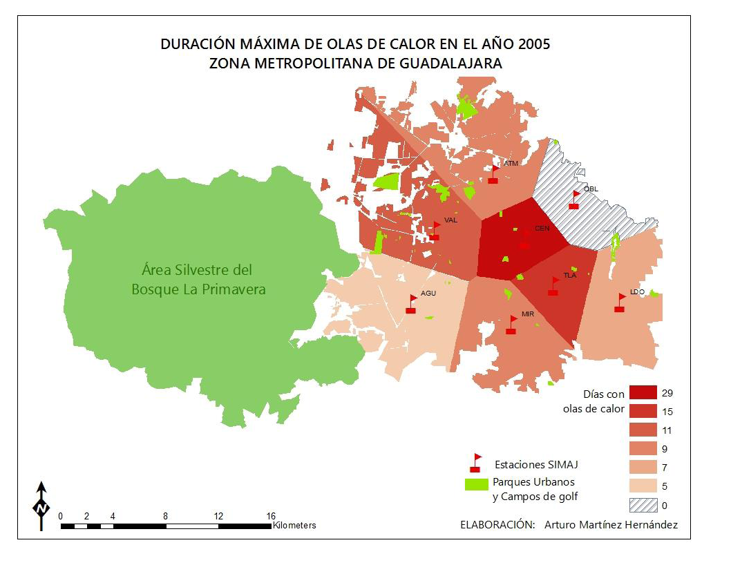 Imaginando futuros diferentes” (2016). Allí, Curiel refiere a una investigación en la maestría de Salud Ambiental del año 2012, que “estima el incremento de temperaturas máximas en la ciudad y el efecto de isla de calor, encontrando que la cabecera municipal de Tlaquepaque al oeste de la metrópoli es donde el aumento de temperatura ha sido mayor a 2 grados centígrados en el periodo 1996 a 2009. La zona más estable es Las Águilas al este de la ciudad –la más cercana al bosque La Primavera–. También describe la exposición al contaminante atmosférico ozono que sufren todos los años los habitantes del Centro y Sur de la ZMG, y todos los años con alta exposición crónica al contaminante PM10.