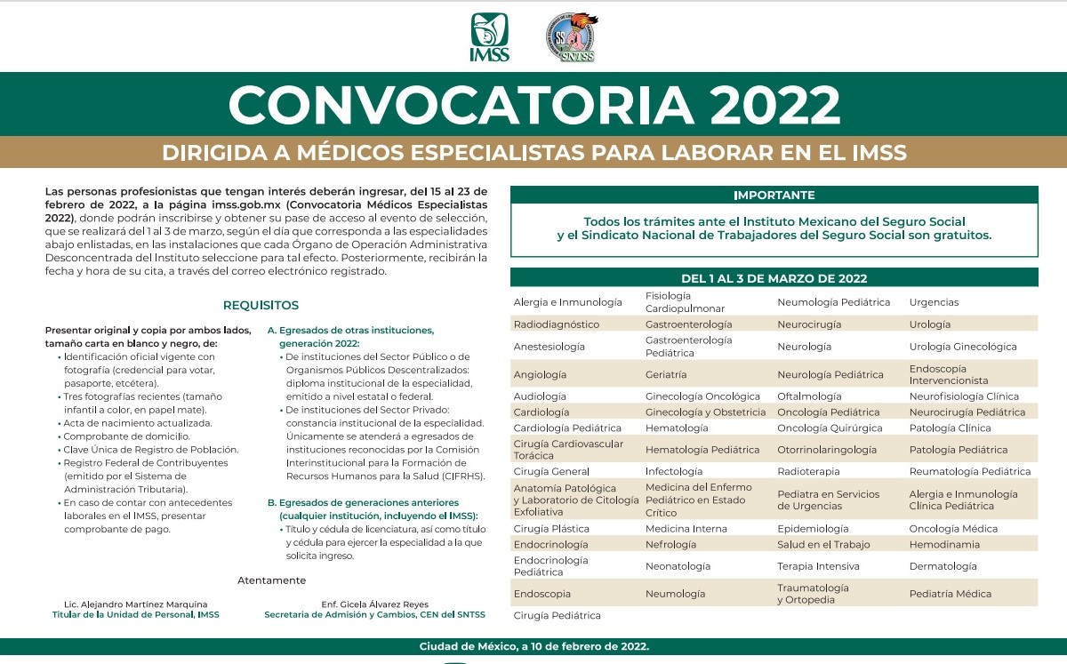 Convocatoria 2022 dirigida a médicos especialistas para laborar en el #IMSS. ????????⚕️????????⚕️#BolsaDeTrabajoIMSS pic.twitter.com/BqnxYlOfVk