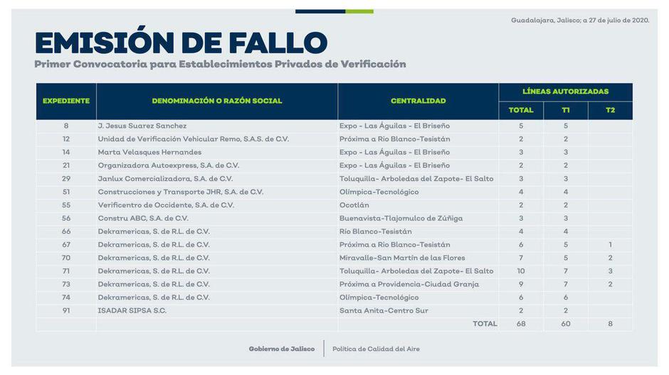 Cabe recordar que en esta convocatoria se están otorgando 68 líneas de verificación (66 en el Área Metropolitana de Guadalajara y 2 en el interior del Estado), mismas que se instalarán en los establecimientos autorizados, que van desde dos hasta diez líneas en cada uno.
