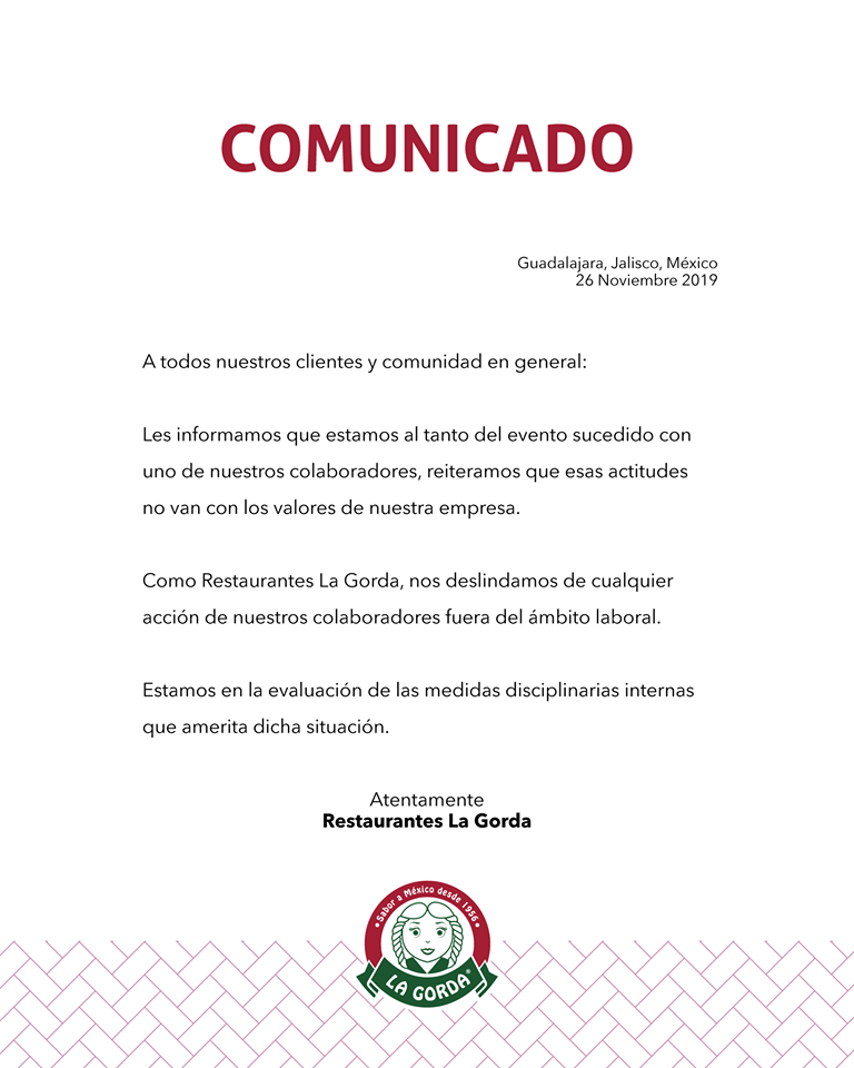 Vía redes sociales se identificó al agresor como colaborador de la cadena de restaurantes La Gorda, pero la empresa de comida ya emitió un comunicado en el que declararon que se encuentran enterados de lo ocurrido y que realizarán las acciones correspondientes.