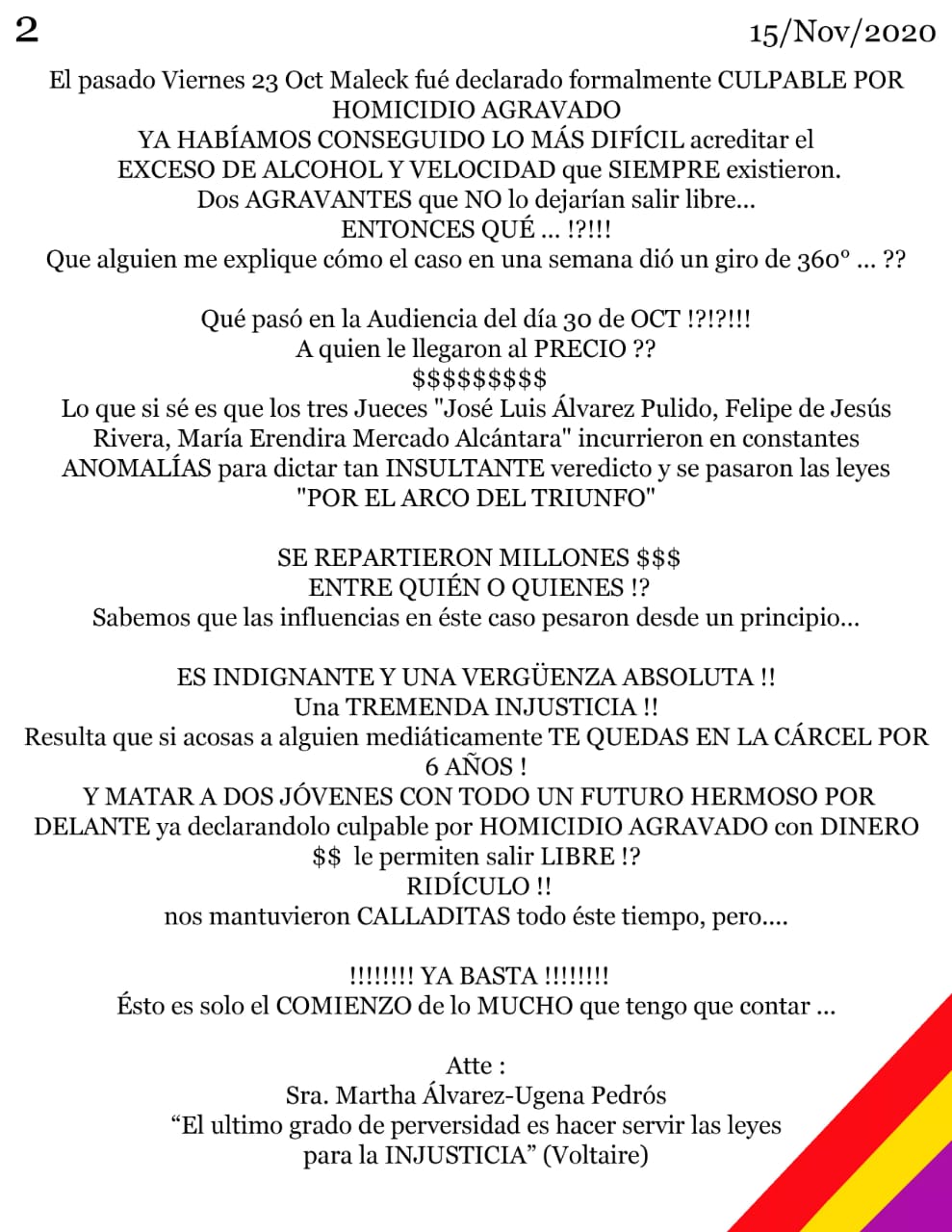 “Qué le pasó a la audiencia del día 30 de octubre?, ¿A quién le llegaron al precio?$$$$$$$$$ Lo que sí sé es que los tres jueces: José Luis Álvarez Pulido, Felipe de Jesús Rivera, Maria Erendira Mercado Alcántara, incurrieron en constantes anomalías para dictar tan insultante veredicto y se pasaron las leyes por el arco del triunfo. Se repartieron millones $$$ ¿Entre quién o quiénes?. Sabemos que las influencias en este caso pesaron desde un principio", prosigue el comunicado.
