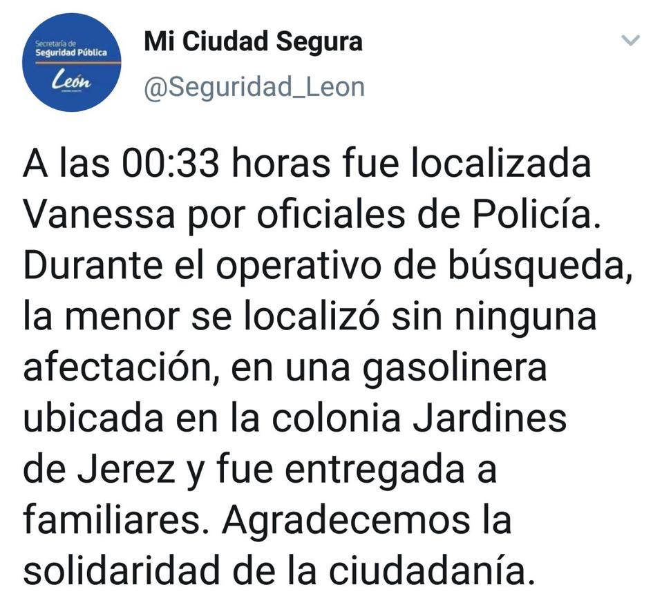 La búsqueda de Vanessa, llegó a su fin tras el anuncio oficial en redes sociales de la Secretaría de Seguridad Pública de León, que por medio de la Policía Municipal, la menor de edad fue localizada en una gasolinera ubicada en Paseo de Jerez a las 00:33 horas del domingo 23 de febrero.