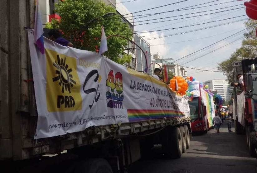 Militantes del PRD se unen a la marcha en su carro alegórico.
